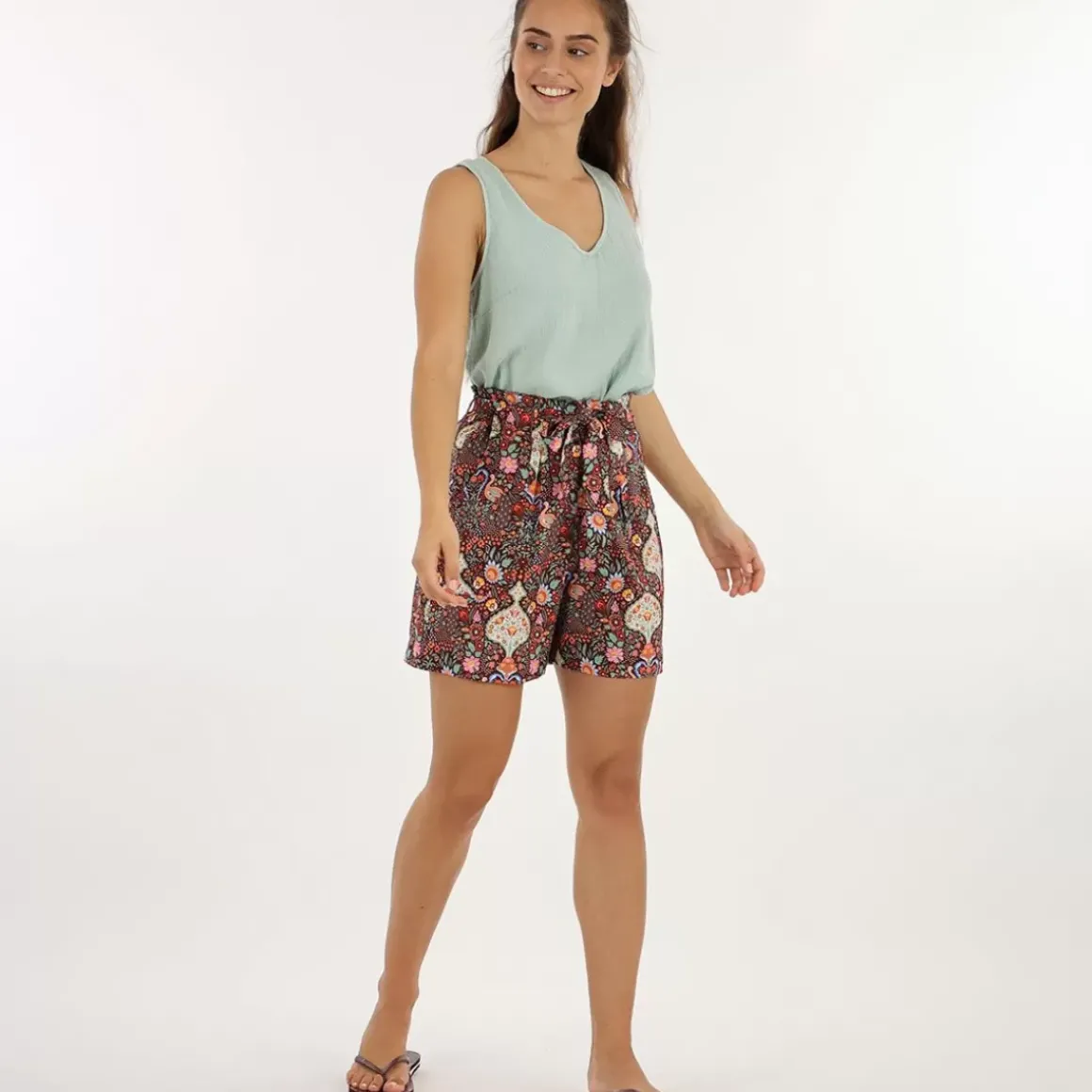 The IOLINA high-waisted shorts in viscose are fluid and light to wear. With their tone-on-tone ribbon belt and pockets, these wrinkle-resistant recycled polyester shorts will be your best summer companion.