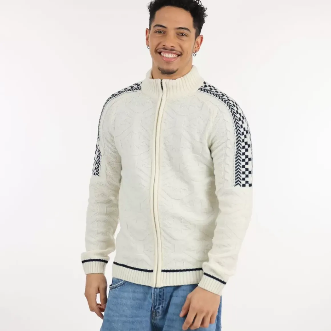 A variation of the PAKAN sweater, the PALDRO is a very warm zipped sweater with a sherpa-lined collar, with tone-on-tone jacquard patterns on the front and shoulders.