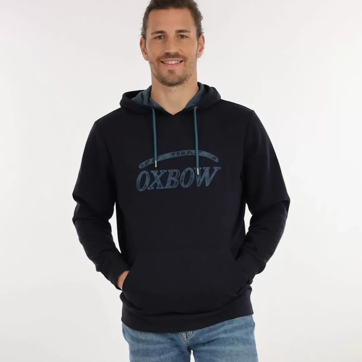 The SAVIORA is an adjustable hoodie with a drawstring and a kangaroo pocket. The OXBOW logo with a camo pattern on the chest is offered.