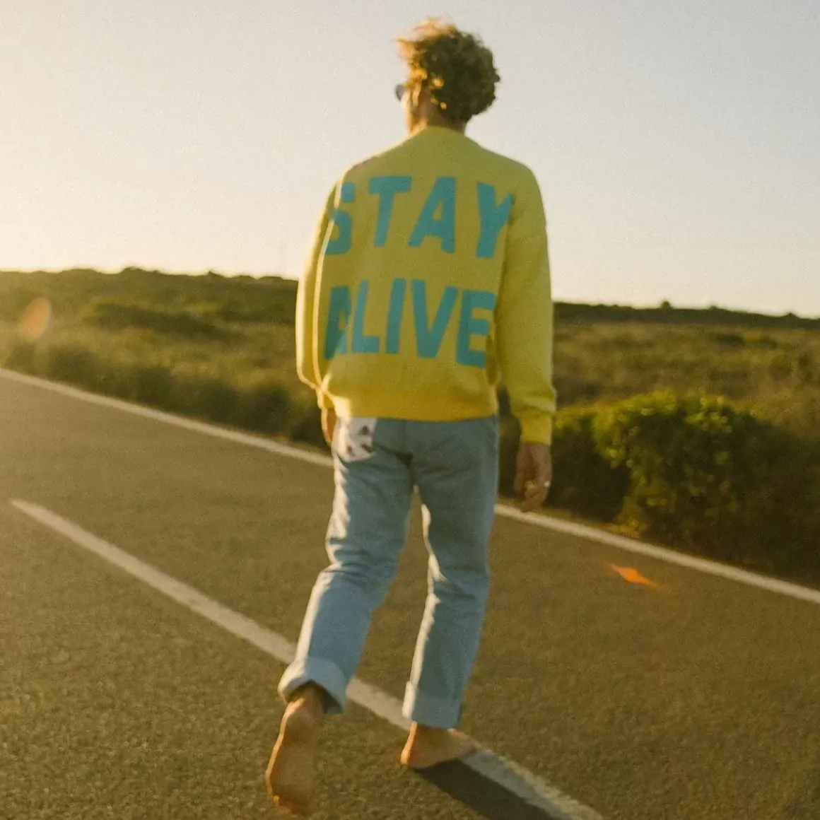 This double jacquard merino wool jumper features Collector’s classic retro cut as well as a shoulder pad and the STAY ALIVE mantra well known to aficionados.