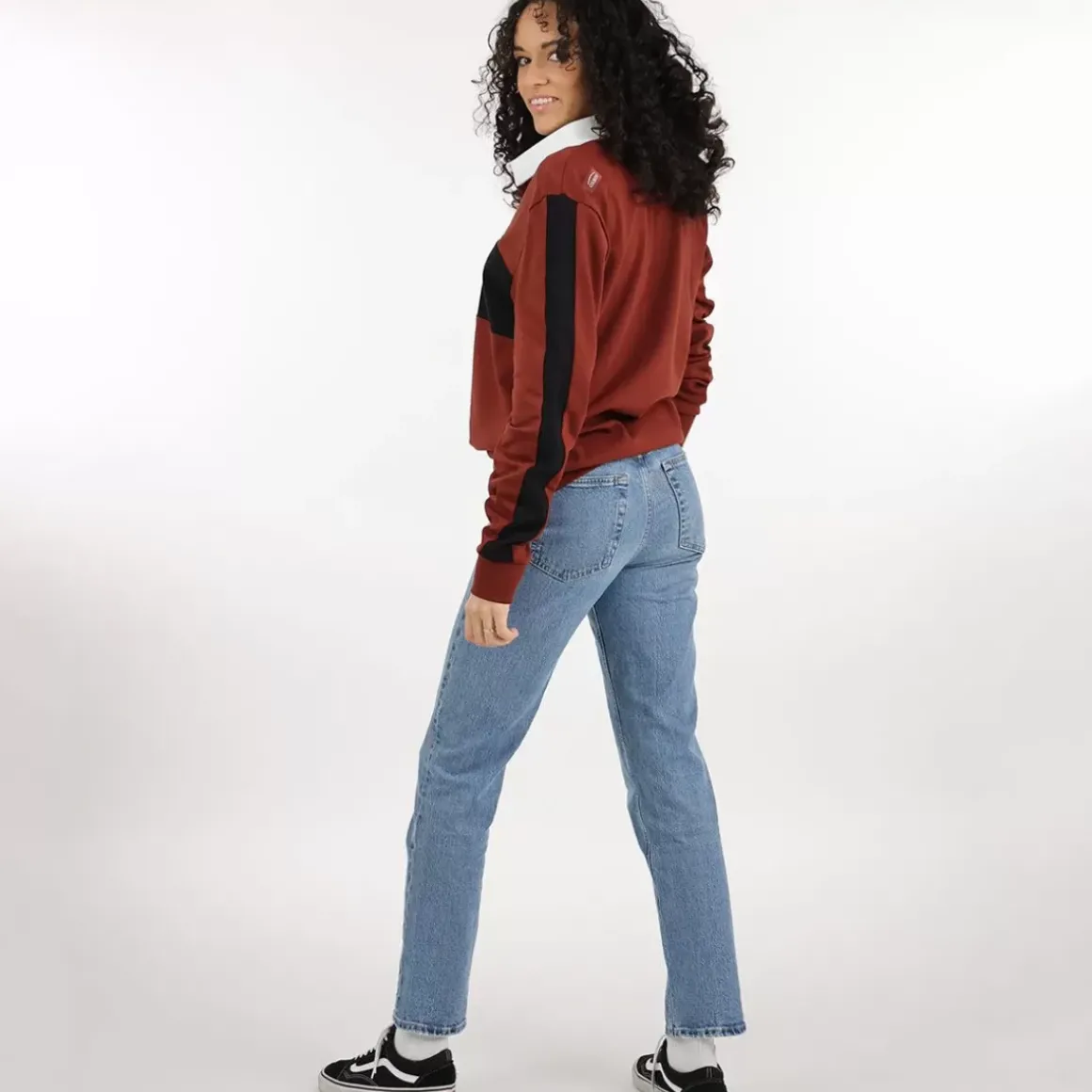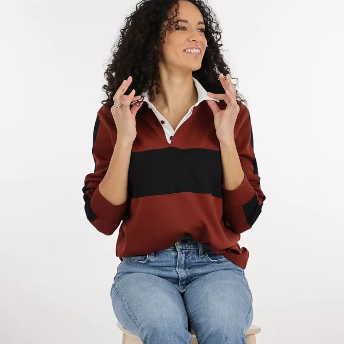 This unisex long-sleeved polo shirt has an embroidered 4 Flowers logo on the chest and a contrast stripe on the sleeves and chest.