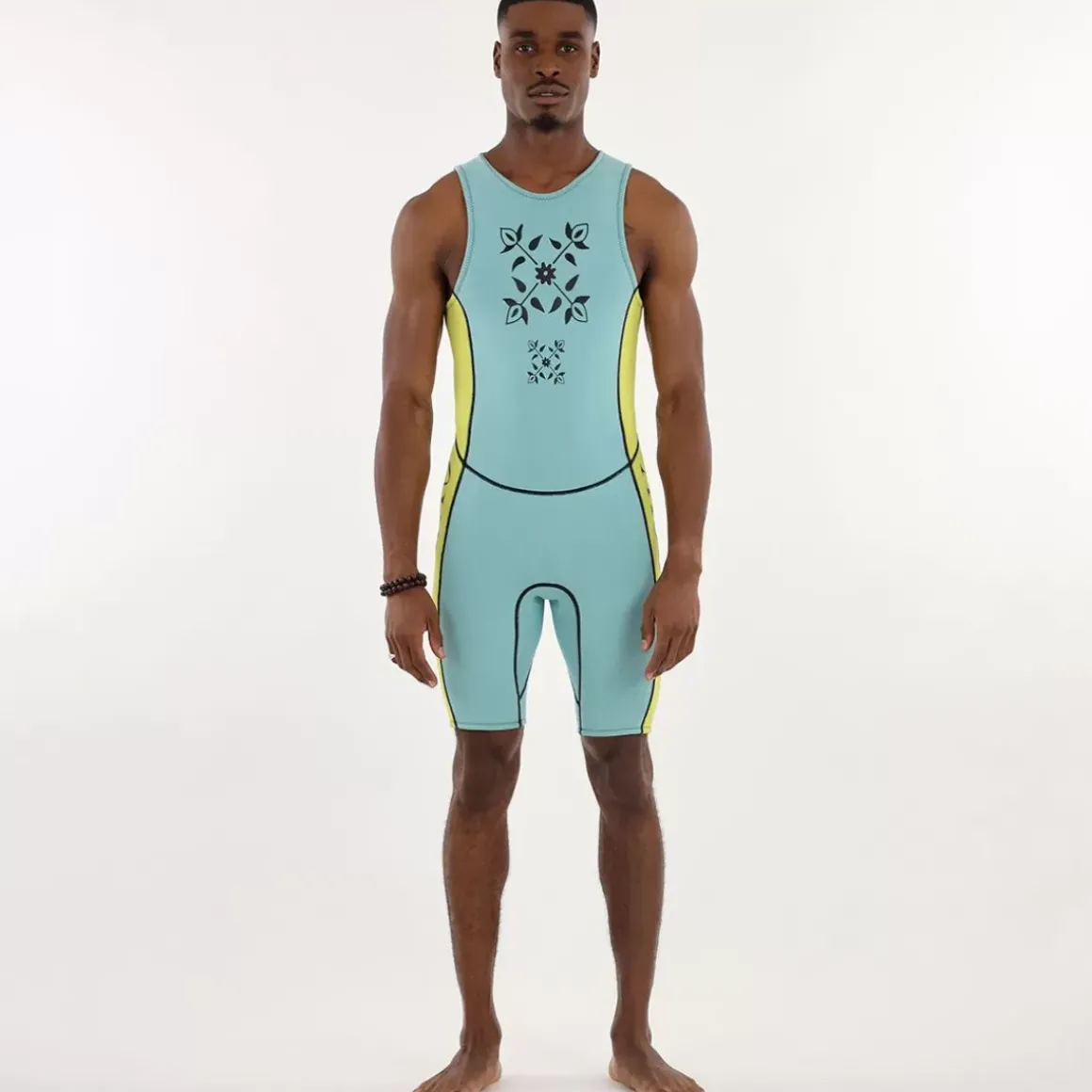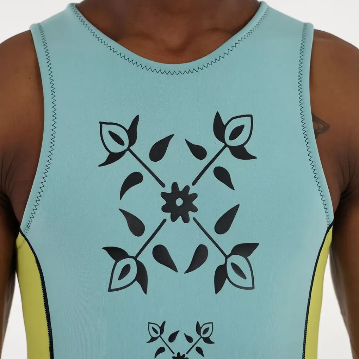 It looks like it’s straight out of the 80s!! 2mm Shortjohn wetsuit, for warm water surfing. In Limestone neoprene, the interior and exterior materials are recycled and laminated with a solvent-free AquaA™ glue.
