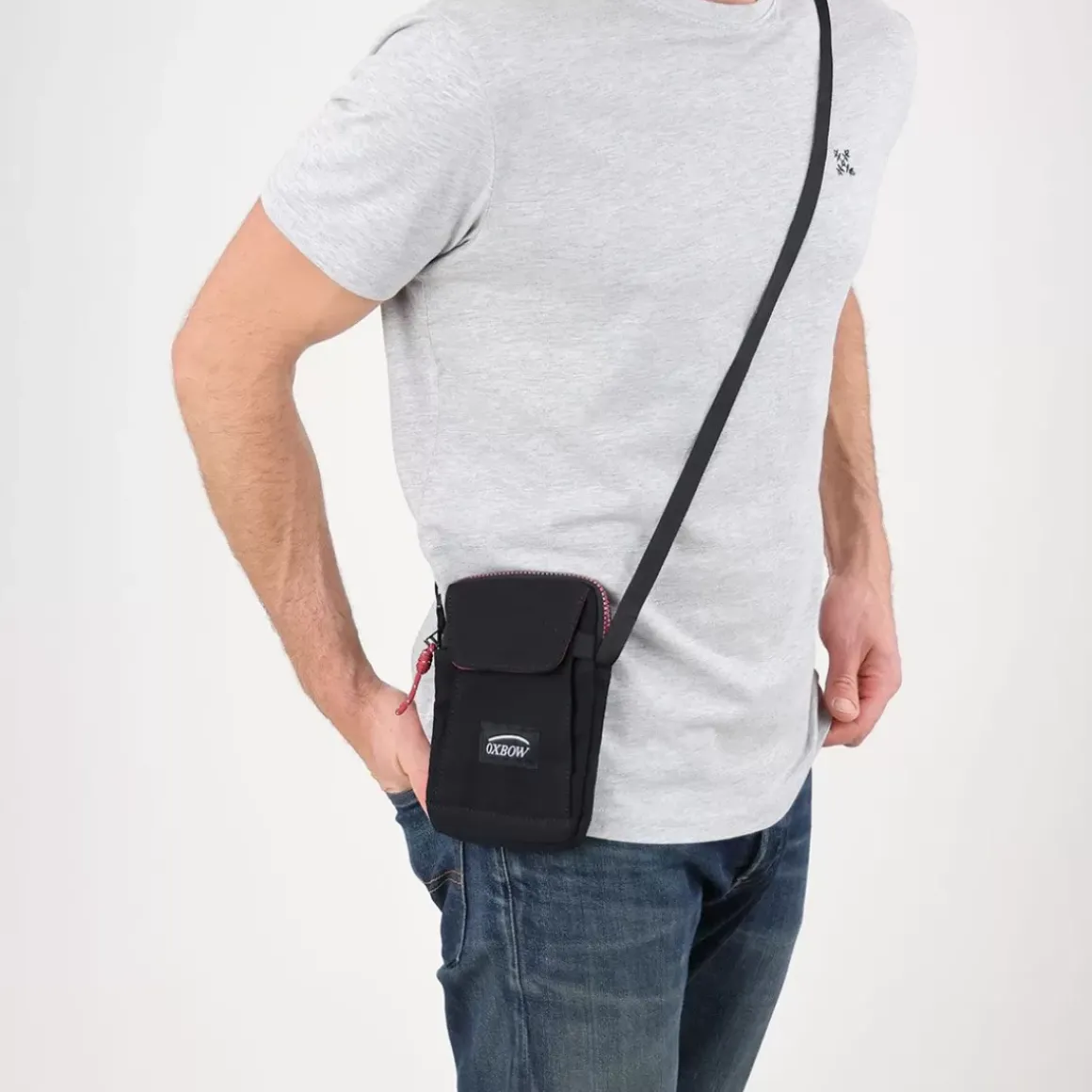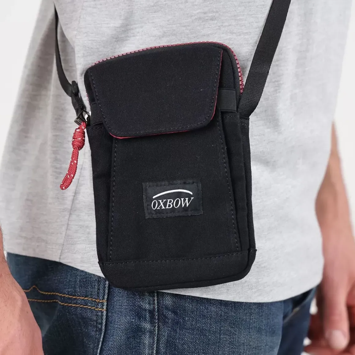 This simple crossbody pouch has a main pocket with compartments and a front pocket closed by Velcro.