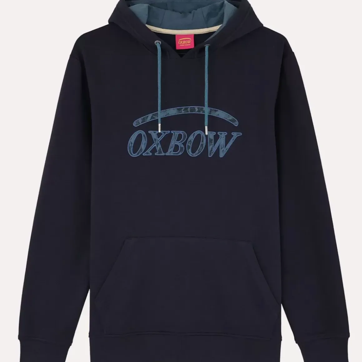 The SAVIORA is an adjustable hoodie with a drawstring and a kangaroo pocket. The OXBOW logo with a camo pattern on the chest is offered.
