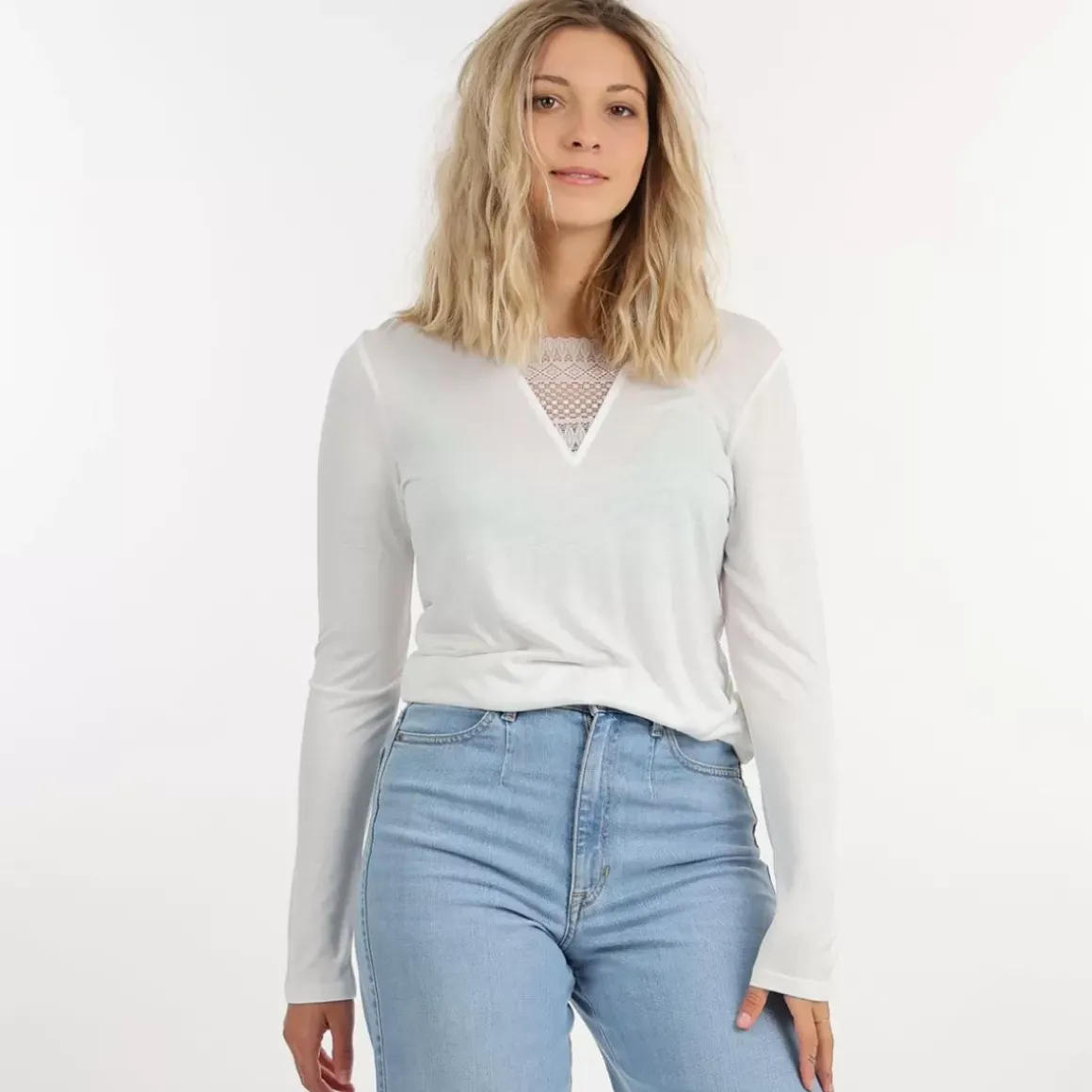We love the lace yoke which makes the model so charming. This top will match your wardrobe for a casual look.